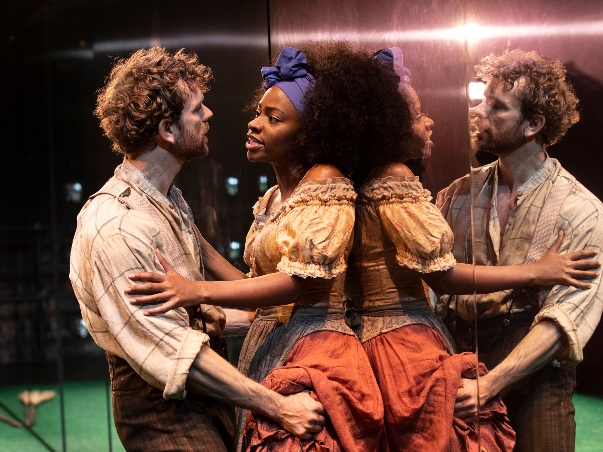 Were it not for its anachronisms, the opening of Jeremy O. Harris’ Slave Play might read like an ugly exploitation movie from the ‘seventies. Overseer Jim (Paul Alexander Nolan) interrupts Kaneisha (Teyonah Parris) while she’s twerking to Rihanna’s “Work” and rapes her. Meanwhile, Alana (Annie McNamara), a bored and thirsty housewife, summons her husband’s light-skinned slave, Phillip (Sullivan Jones), so she can hear “the negro music you play for the ladies down at y’all’s cabin.” He plays “Ignition” on the violin, she announces she is under “some sort of mulatto spell,” unsheathes a “long ebony dildo,” and rapes him, too. For what it’s worth, the relationship between the slave overseer Nigger Gary (Ato Blankson Wood) and the white indentured servant Dustin (James Cusati-Moyer) is more consensual, with a scuffle turning into a frenzied fuck.